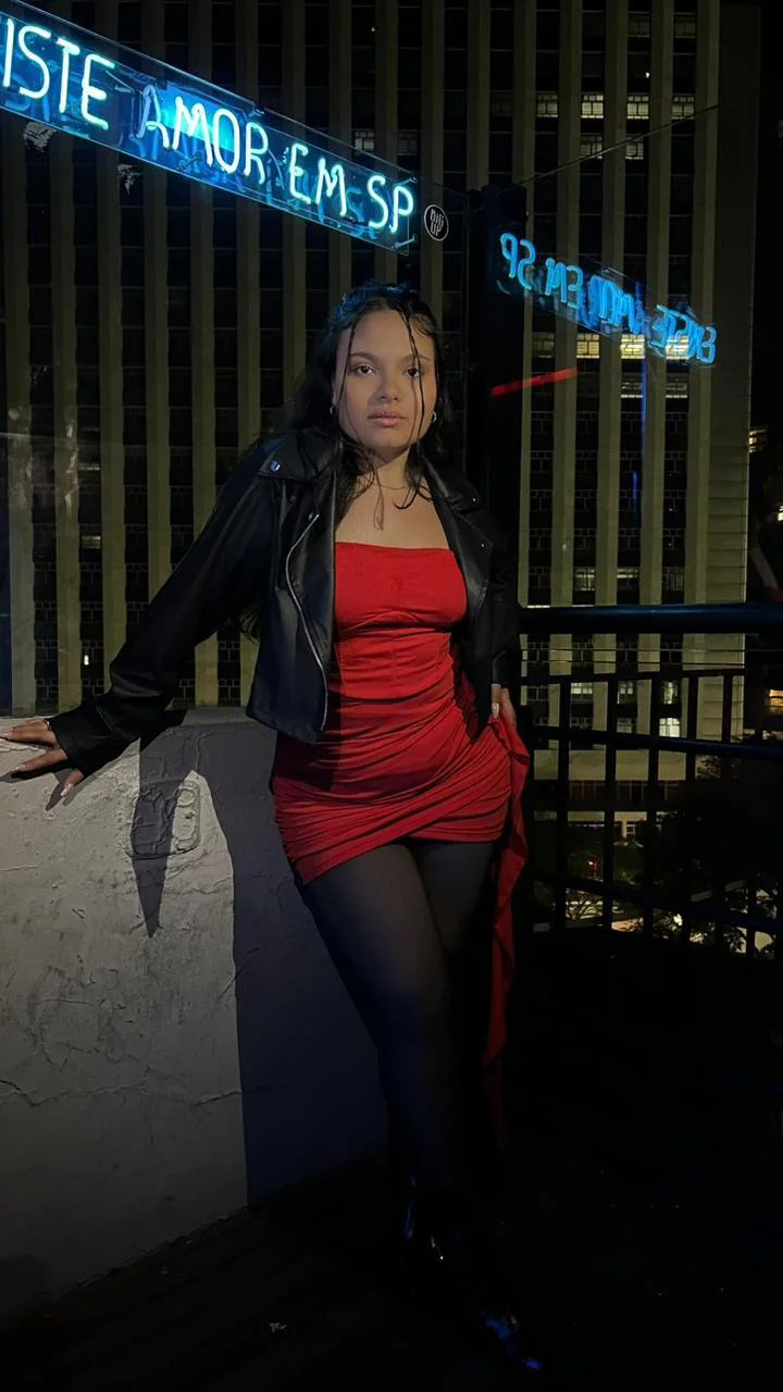"You know I love red, right? ❤️ But there's something special about combining a short red dress with black tights at night. I feel more confident, less shy, and ready for any adventure. What do you think of this look? Does it suit me?"